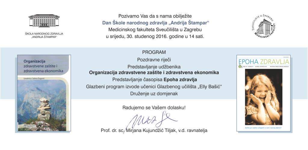 Obilježavanje Dana Škole narodnog zdravlja “Andrija Štampar” održati će se u srijedu, 30.11.2016. s početkom u 14 sati (predviđeno trajanje do 15,30 sati) u dvorani A, Rockefellerova 4, Zagreb.