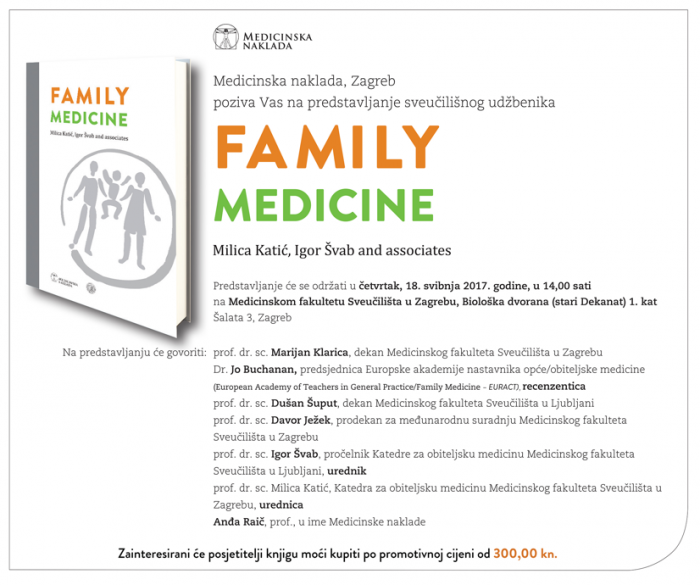 Medicinska naklada poziva Vas na predstavljanje sveučilišnog udžbenika “Family medicine” koje će se održati u četvrtak 18. svibnja 2017.g. u 14.00 sati na Medicinskom fakultetu Sveučilišta u Zagrebu, Biološka dvorana 1. kat, Šalata 3, Zagreb.